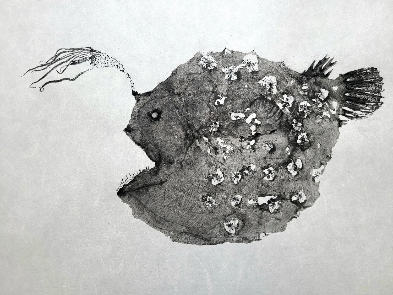 After weeks of keeping it all under wraps, we are finally able to share the gyotaku art that we were invited to create of this ultra rare and pristine Pacific Footballfish. A type of deep sea Anglerfish that is only one of about 30 adult female specimens ever found.