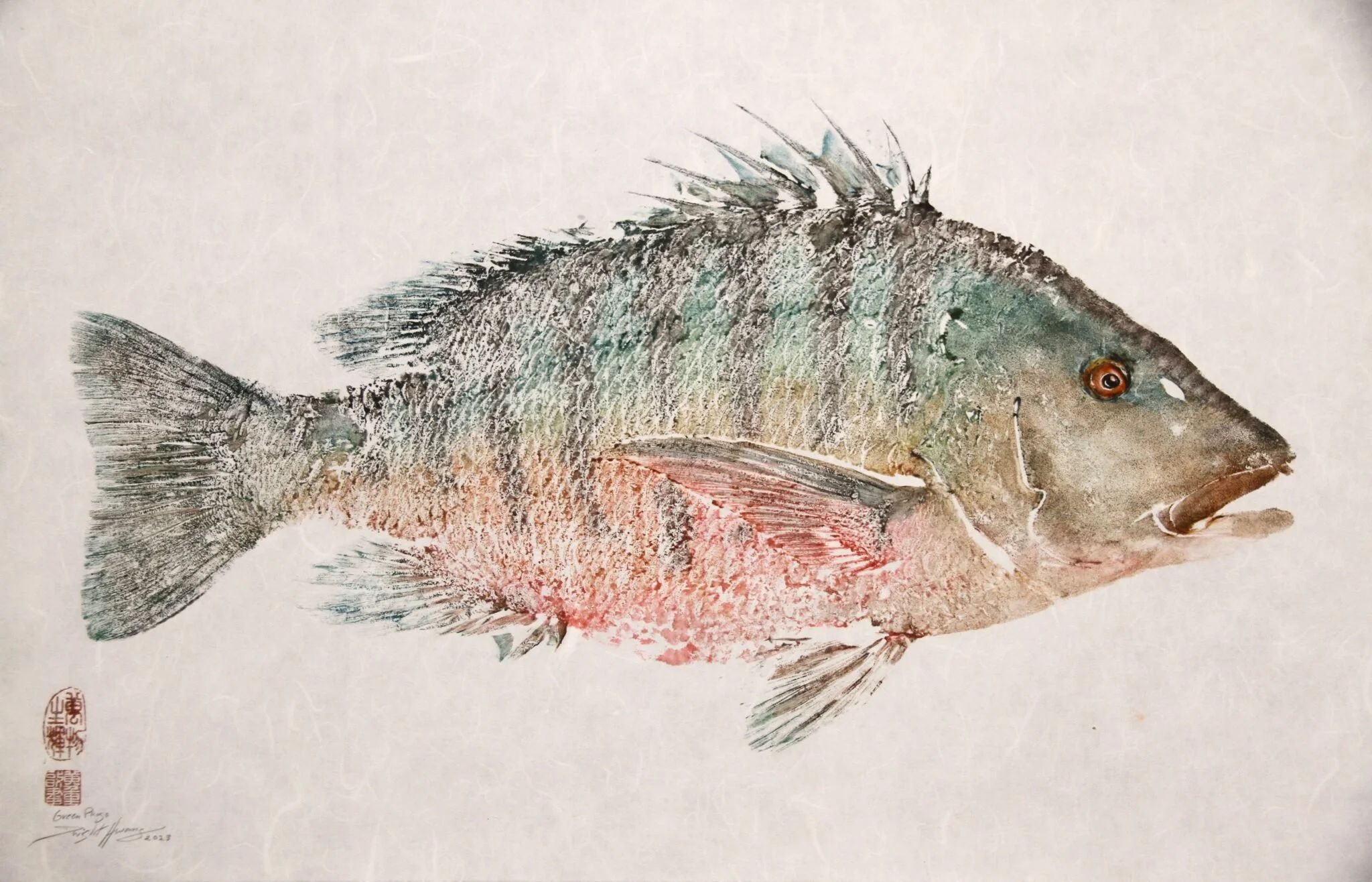 Gyotaku of a tropical lionfish swimming within coral sea fans, by Dwight Hwang.