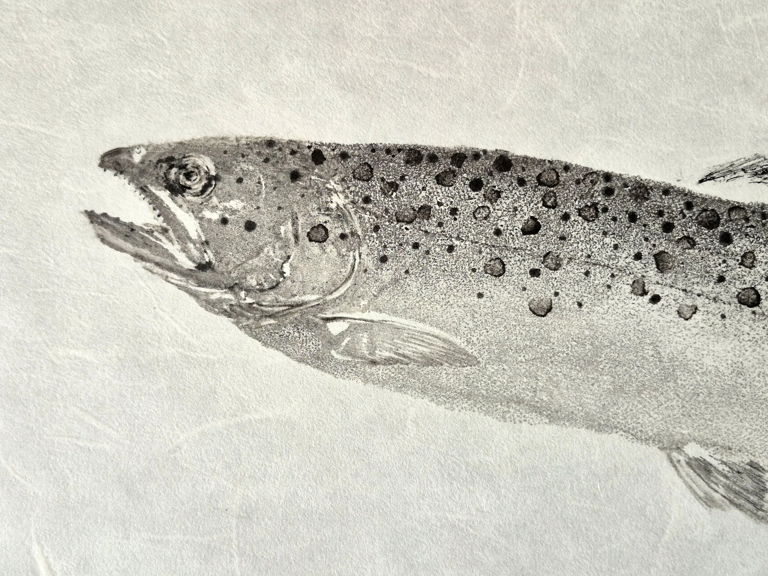Gyotaku of a pair of Yellow Perch in color, with an aquatic plant, by Dwight Hwang.