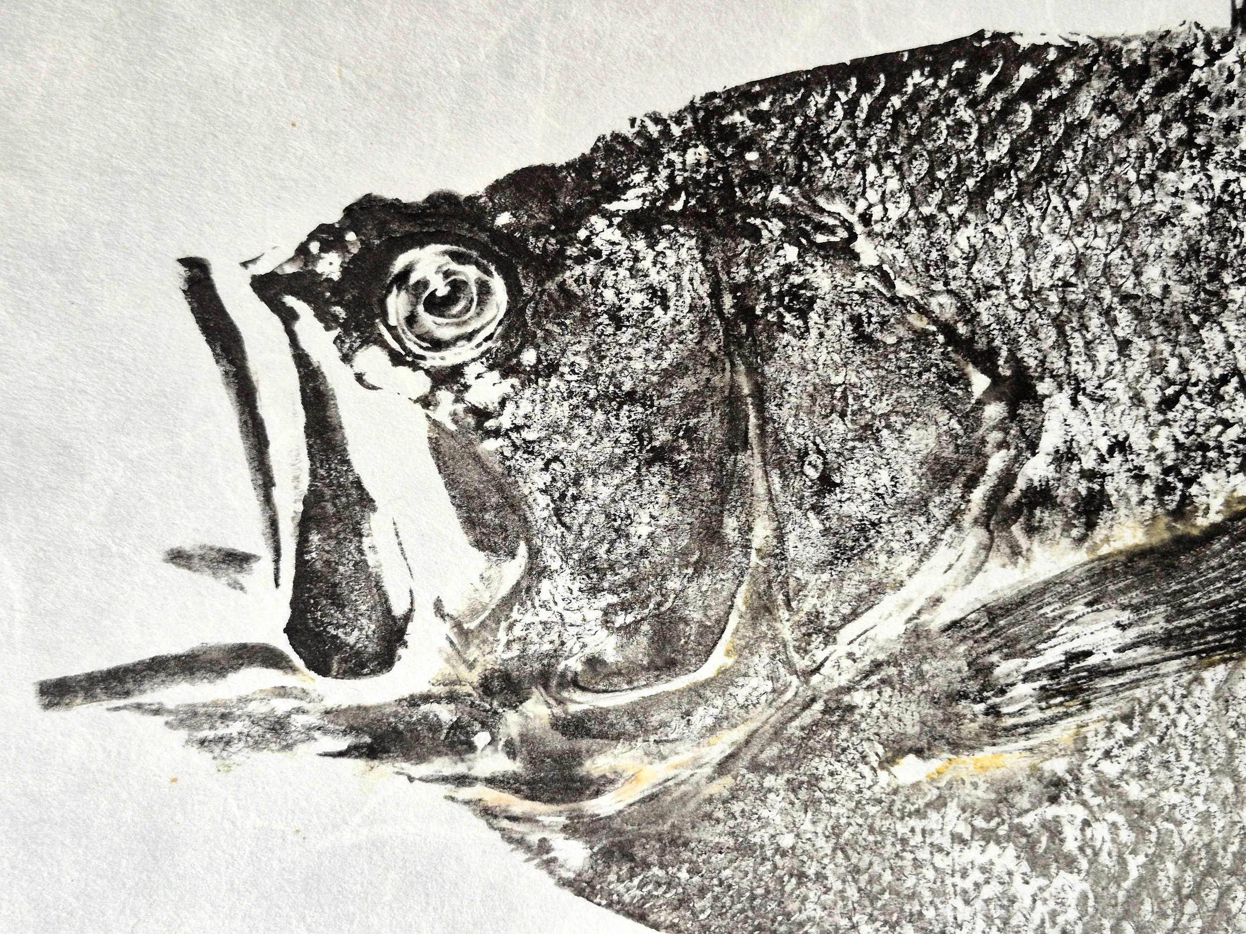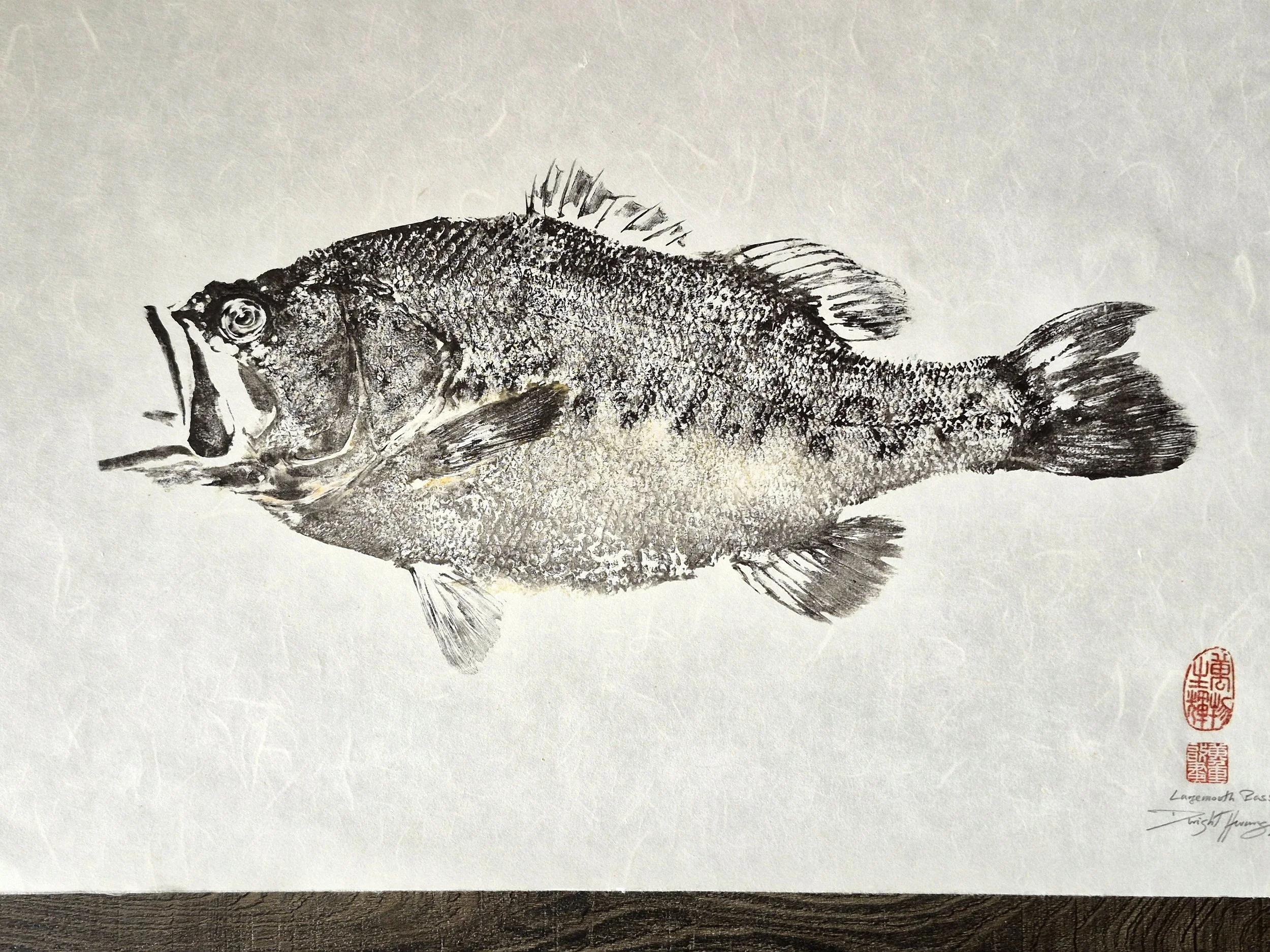 Gyotaku of a juvenile Brown Trout. I will add your choice of fly on the right side of the piece. By Dwight Hwang.